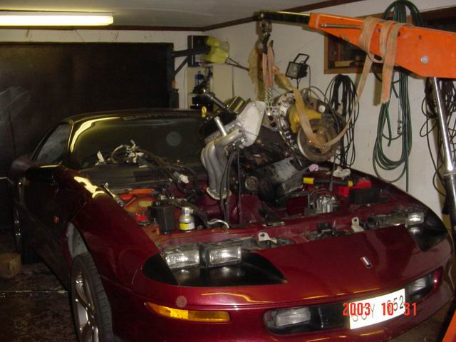 Blocket 383 ci på plats i garaget igen, fick modifiera oljetråget lite för att få motorn att gå runt.