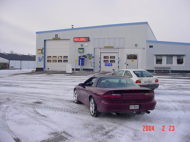 Självklart hade det snöat natten innan besiktningen, och självklart vägrar bilen starta kl 07.45 på morgonen så det var bara att plocka batteriet ur bruksbilen bära in det i garaget och kabla igång camaron och sladda iväg till besiktningen, förvarnar bes mannen om att batteriet är kasst och att vi lämpligen inte bör stänga av motorn, men det brukar ju gå bra enligt honom (det resulterade i 2 kabelstarter från en dåligt laddad batterivagn i hallen och en utanför då han lyckades få motorstopp när han körde ut ur hallen.) I det läget började jag bli lite besviken speciellt när avgasvärdena inte liknade någonting, men han höll humöret uppe i alla fall och körde (sladdade) ut och gjorde ett nytt avgastest med en sensor intryckt i avgassystemet istället för upplägget med dubbla avgasslangar och då såg det riktigt bra ut. Det hela slutade med nedslag på positionslysena och en påpekan att positionlysena egentligen är dimljus och inte får användas som tillsammans med halvljus.